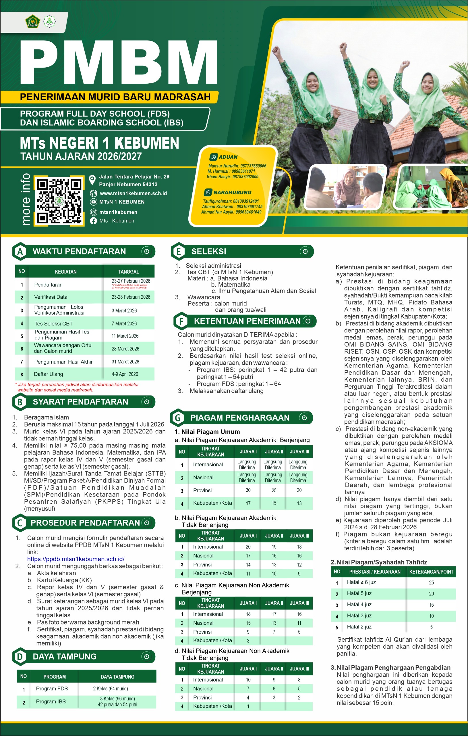 PPDB MTsN 1 Kebumen Program Kelas Full Day School dan Islamic Boarding School dibuka tanggal 23 s.d. 27 Februari 2026.